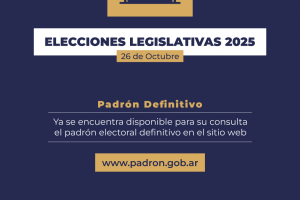 "El 26 de octubre se celebrarán las Elecciones Legislativas 2025 y ya se puede consultar el Padrón Electoral Definitivo en www.padron.gob.ar. Ingrese su DNI y seleccione "Argentinos en el exterior", en el apartado "Distrito" para verificar sus datos y lugar de votación".